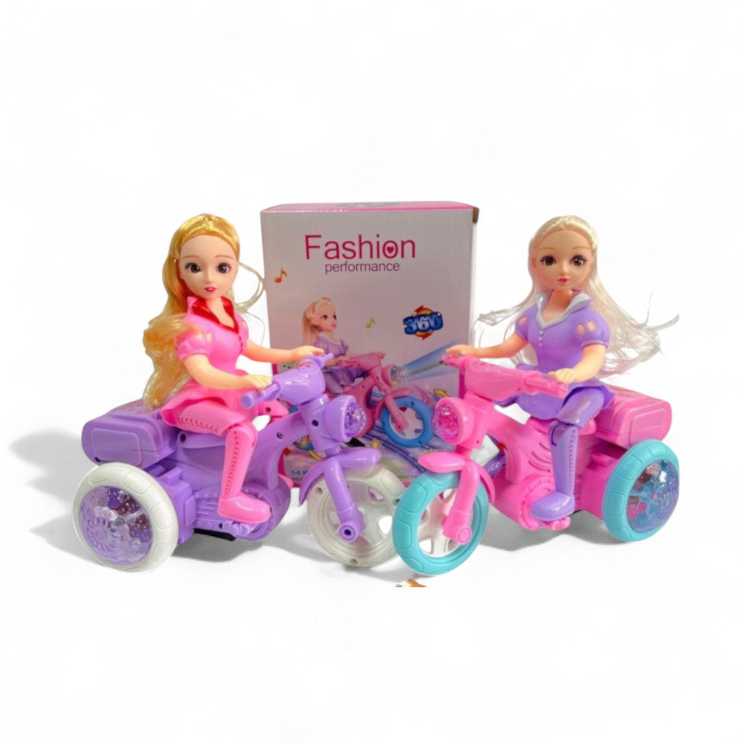 Muñeca con moto, luz, sonido, movimiento. Utiliza pilas